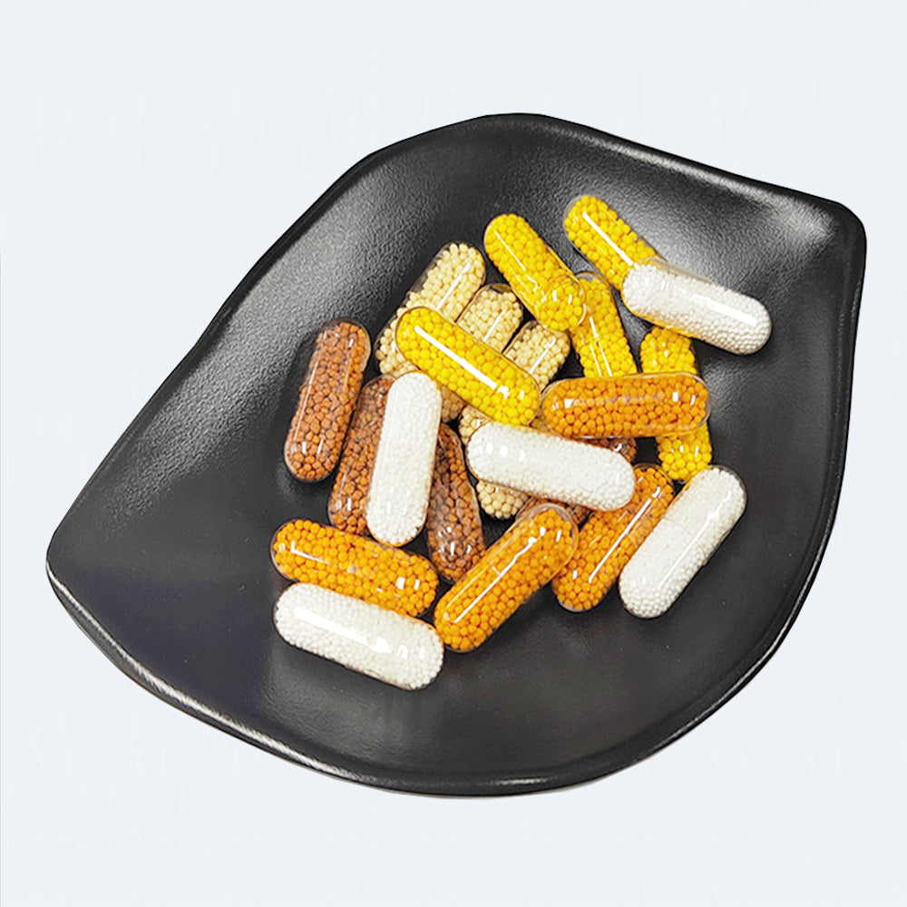 直径 0.8 ~ 1.4 mm のボールは、表面が丸く、粒子サイズが均一で、カスタマイズして任意の色を追加できます。色は主に天然色素と、リボフラビンなどの一部の有色ビタミンから得られます。ご存知のように、一部の成分は流れにくく、カプセルに簡単に収まりませんが、ペレットはこの問題を完璧に解決します。透明なカプセル シェルの中でとても美しいのがわかります。